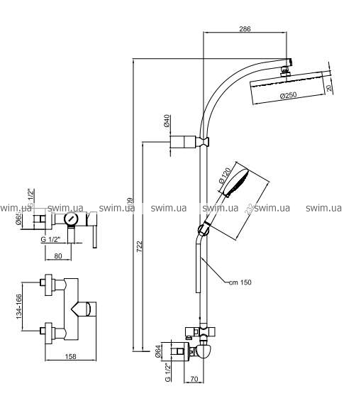 - С душевой штангой, верхним душевым зонтом и ручным душем