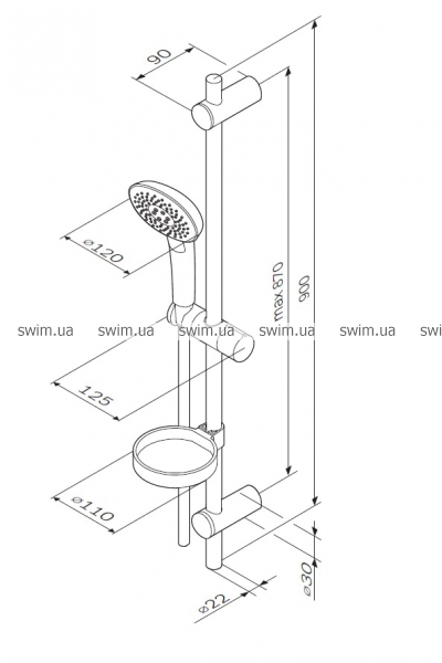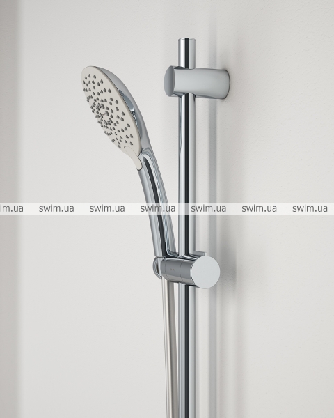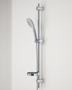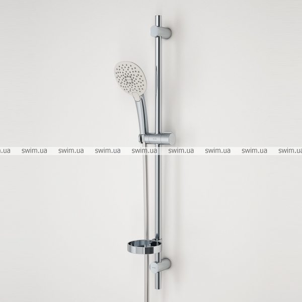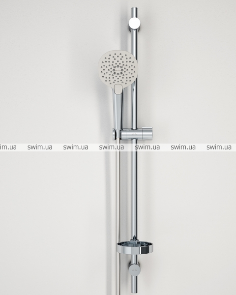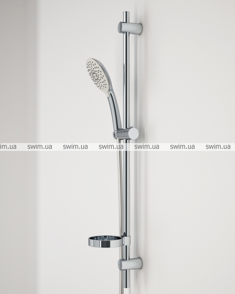 Продуманные детали для удобства использования: душевая штанга 900 мм, душевой силиконовый шланг 1750 мм, ручной душ 120 мм, мыльница Ø 110 мм, регулируемые по высоте держатели душевой штанги.