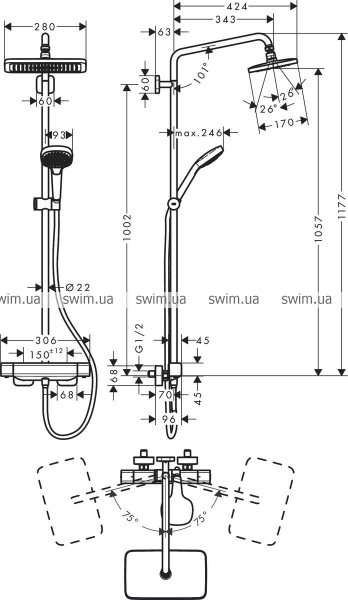 - состоит из: верхний душ, ручной душ, термостат для душа, штанга для душа, держатель для душа