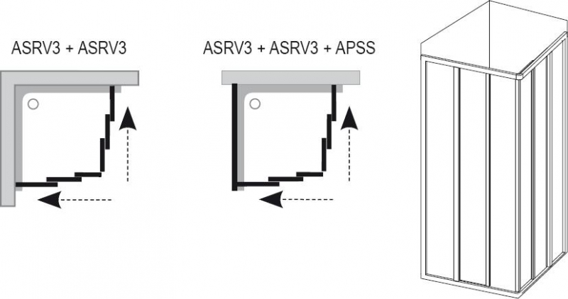Самый широкий прямоугольный вход. С помощью комбинации разных размеров изделия ASRV3 можно получить квадратный или прямоугольный варианты. При соединении двух ASRV3 с неподвижной стенкой образуется “П”- образный душевой уголок. Комбинируются только с неподвижной стенкой APSS (высота 1880 мм).