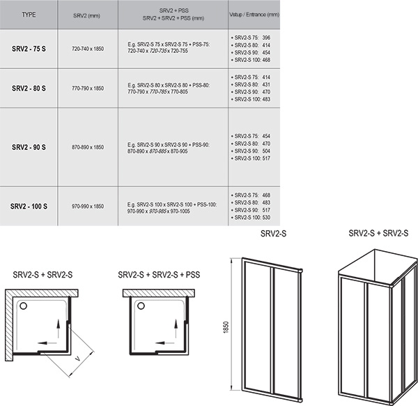 С помощью комбинации разных размеров изделия SRV2-S можно получить квадратный или прямоугольный варианты. При соединении двух SRV2-S c неподвижной стенкой образуется “П”- образный душевой уголок. Комбинируются только с неподвижной стенкой PSS (высота 1850 мм).