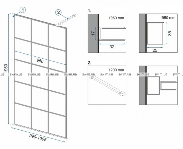 - Скло кріпиться до стіни за допомогою пристінних профілів