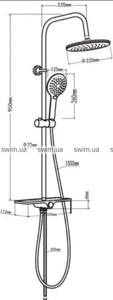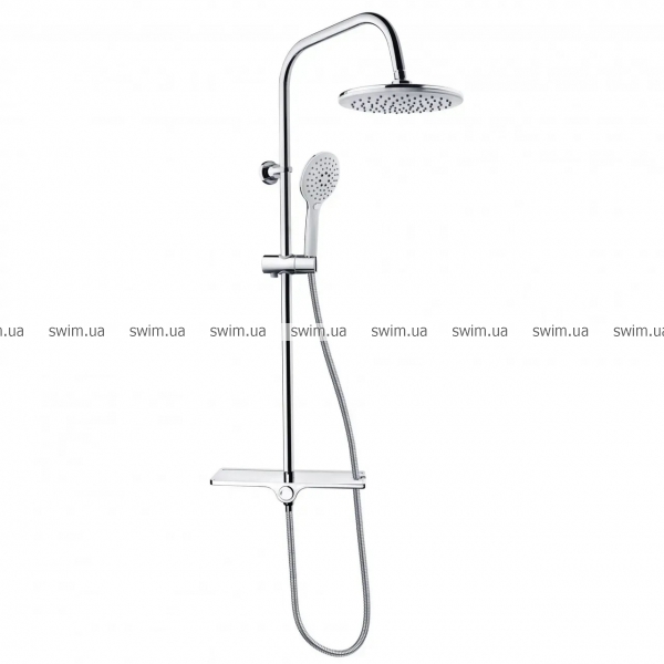 - Лійка верхнього душу 250мм, ручна лійка на 2 режими, обидві лійки комбінація кольорів білий з хромом. Кнопка перемикання на полиці змінює подачу води між лійкою верхнього душу та ручною лійкою.