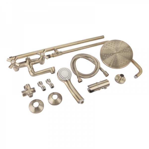 - Комплектація: змішувач, кронштейн для верхнього душу, лійка для верхнього душу, кронштейн для ручного душу, лійка для ручного душу, душовий шланг, душова стійка, кріплення.