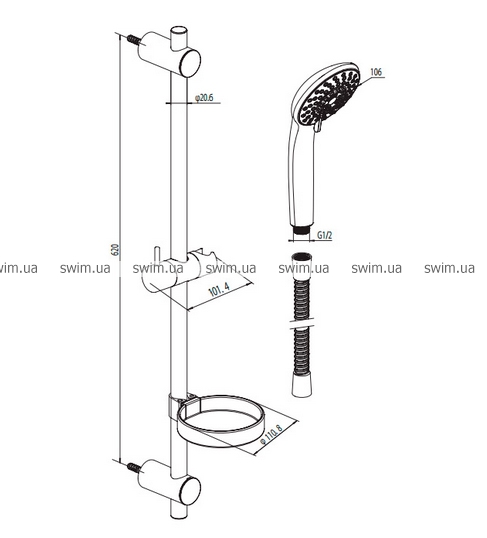 - Комплектація: ручний душ, штанга, душовий шланг, тримач для душу, мильниця