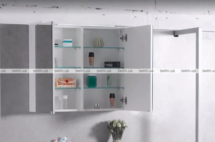 Ідеальна дзеркальна шафа MC-10 (ШЗ-10) Fancy Marble дуже актуальна для ванної кімнати, дзеркало зроблять ванну кімнату яскравішою і збільшують внутрішній простір приміщення. У своїй конструкції дзеркальна шафа має два закриті відділення, простір яких розділений скляними полицями. Дзеркальна шафа оснащена LED-освітленням, а також укомплектована кнопкою-вимикачем. Корпус та фасадні частини виготовлені із МДФ товщиною 16 мм, поверхня меблів покрита вологостійкою ПВХ-плівкою. Акуратна шафа виконана в класичному кольорі білий глянець, з можливістю виготовити в кольорі білий матовий і матовий графіт. Головною особливістю є вологостійке полотно, призначене для експлуатації у приміщеннях із підвищеною вологістю; стриманий та унікальний дизайн; динамічні лінії, прямокутні форми; відсутність ручок, система Push to Open; система «Soft close», яка забезпечує плавне та м'яке закривання. Fancy Marble – уособлення по-справжньому високої якості, витонченого дизайну та відмінної функціональності.