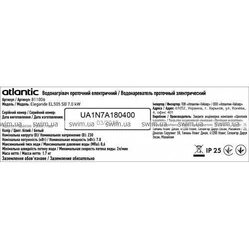 Електричний проточний водонагрівач Atlantic Elegande EL505 SB 7.0 kW 811006