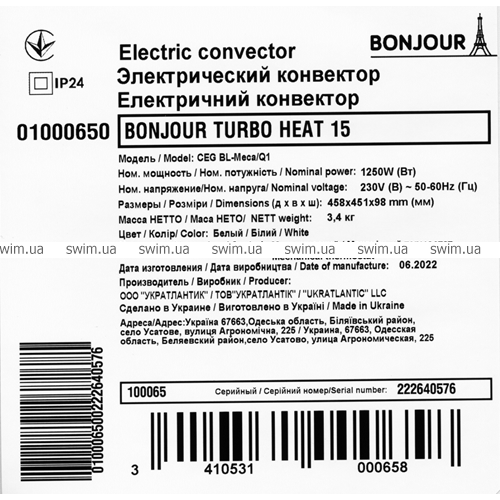 - Комплектація: конвектор, комплект ніжок, посібник з експлуатації, упаковка