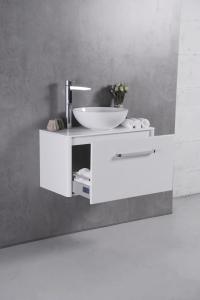 Корпус шафки та фасад виготовлений з плити МДФ, яка покрита вінілової плівкою стійкою до стирання. Висувна скринька встановлена на систему висування "Linken system" LS Box. Виріб призначений для використання у ванній кімнаті та виготовлений із якісних вологостійких матеріалів.