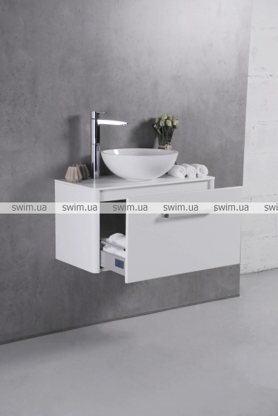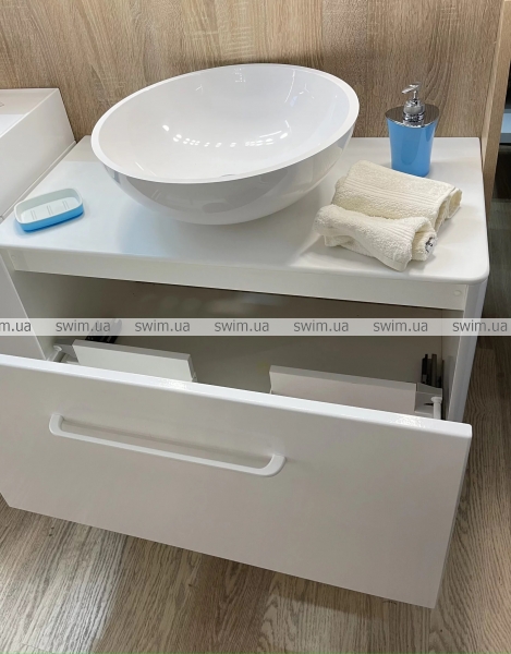 Корпус шафки та фасад виготовлений з плити МДФ, яка покрита вінілової плівкою стійкою до стирання. Висувна скринька встановлена на систему висування "Linken system" LS Box. Виріб призначений для використання у ванній кімнаті та виготовлений із якісних вологостійких матеріалів.