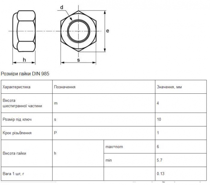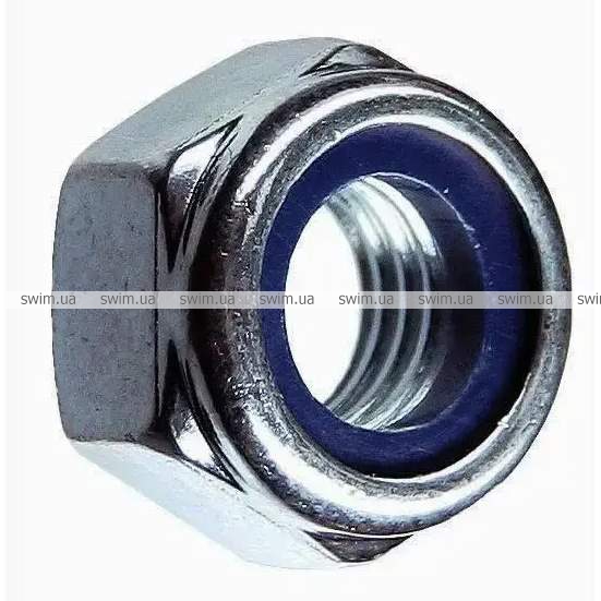 Гайка самоконтряща М6 виробляється згідно стандарту DIN 985. Конструктивною особливістю є наявність нейлонового кільця, яке забезпечує герметичність і стопоріння в різьбовому з'єднанні з метричними болтами, гвинтами, різьбовими шпильками. Самостопоряща гайка застосовується при складанні, з'єднанні елементів конструкцій у загальнобудівельних роботах, а також складальних виробничих роботах. Для захисту від іржі самозатягуюча гайка покривається шаром цинку. Клас міцності даного кріплення – 6.0.