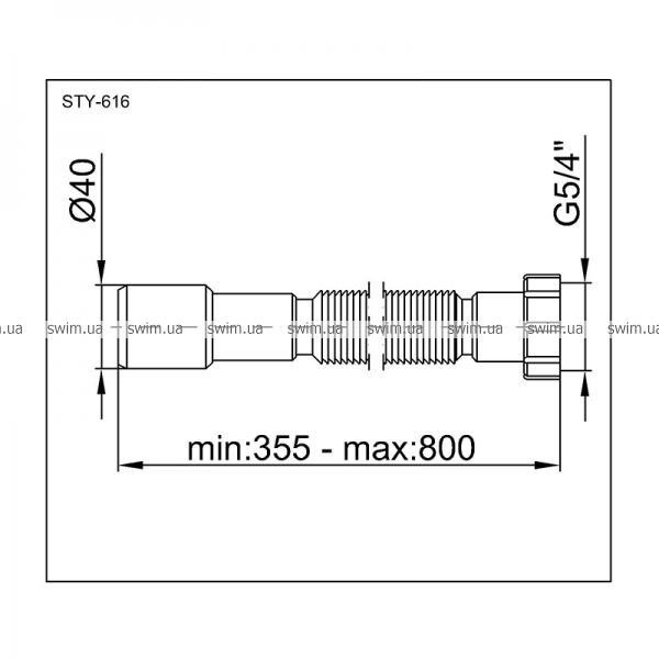 - Длина гибкой трубы: минимум 355 мм, максимум 800 мм
