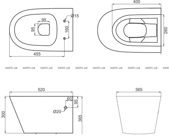 - Габарити унітаза (ВхШхГ) 36.5 х 36.5 х 52 см