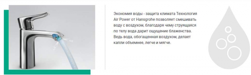 Экономия воды - защита климата Технология Air Power от Hansgrohe позволяет смешивать воду с воздухом, благодаря чему струящаяся по телу вода дарит ощущение блаженства. Ведь вода, обогащенная воздухом, делает капли объемнее, легче и мягче.