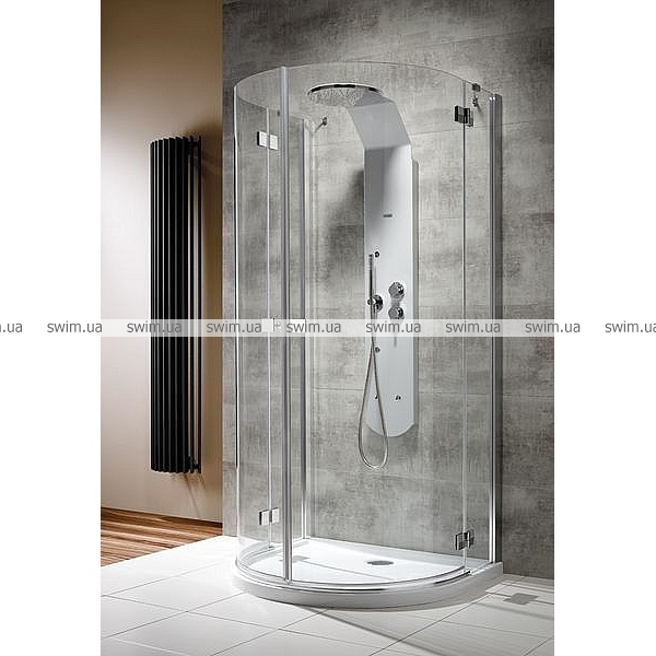 Пристенная, полукруглая кабина с двустворчатой распашной дверью и узкими боковыми стенками.