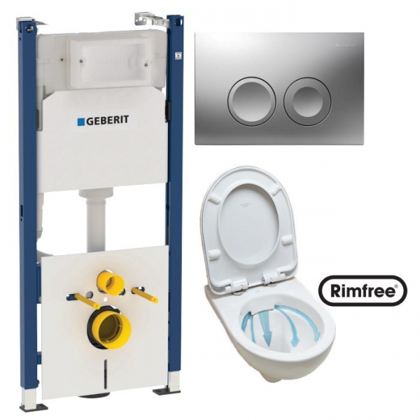 Комплект 6 в 1 унитаз подвесной Kolo Nova Pro Rimfree M33120000 с сидением Kolo Nova Pro M30112000 с комплектом Geberit Duofix 3в1 458.126.00.1 и клавишей смыва Geberit Delta 21 115.125.46.1