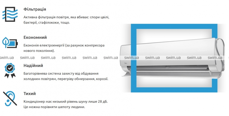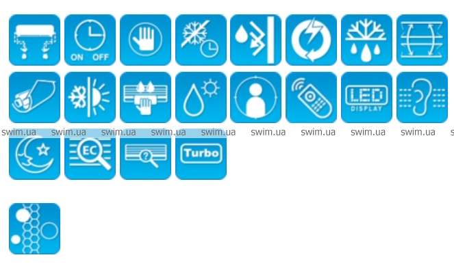 - Додатково 24-годинний таймер; Опція WiFi; Турбо режим; Самодіагностика; Нічний режим; Автоперезапуск; Гідрофільне покриття; Запам'ятовування позицій жалюзі;