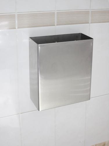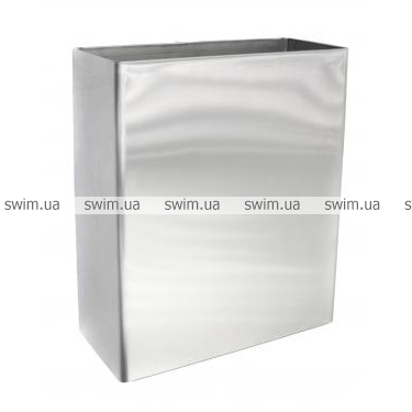 Настенный контейнер для мусора Nofer 14077.S выполнен из нержавеющей стали AISI 304 и может быть монтирован как на пол, как и на стену, имеются  зажимы для полиэтиленовых пакетов. Корпус контейнера не имеет острых углов, а стенки корпуса имеют толщину 1,0 мм, благодаря этим качествам контейнер настенный считается антивандальным.