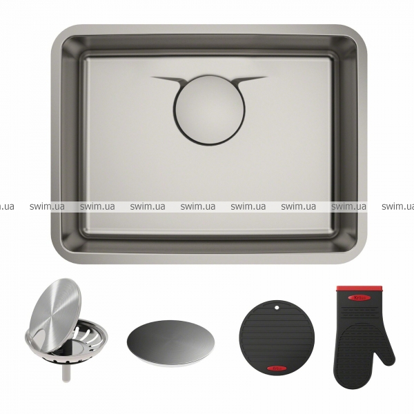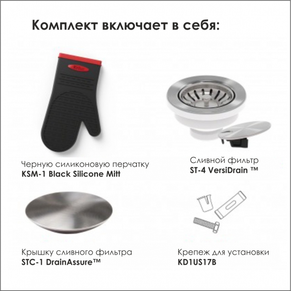 Комплект включает в себя: мойку серии Dex™; сливной фильтр ST-4 VersiDrain ™, Крышку сливного фильтра STC-1 DrainAssure ™, Черную силиконовую перчатку KSM-1 Black Silicone Mitt, Черную силиконовую подставку KST-1 Black Silicone Trivet