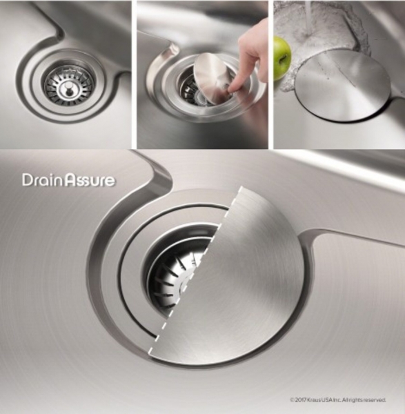 Дренажная крышка DrainAssure ™ скрывает сток для удаление мусора и арматуру измельчителя отходов, обеспечивая идеальный бесшовный вид, а также дополняет общий дизайн; открытые стороны сливных каналов обеспечивают оптимальный дренаж