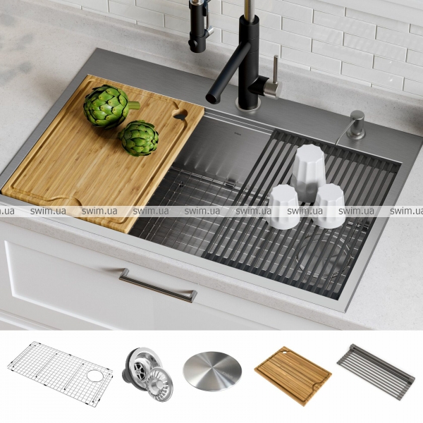 Делайте больше с Kore™ - идеальной мойкой для современного домашнего шеф-повара. Вдохновленная профессиональными кухнями, серия Kore™ Workstation мгновенно превращает вашу кухонную мойку в полноценную станцию подготовки. Универсальная конструкция с двойным способом крепления позволяет устанавливать эту мойку как врезную на любой тип кухонной столешницы. 4-миллиметровый бортик со скошенным краем плотно прилегает к столешнице, чтобы обеспечить идеальный законченный вид. Интегрированные внутри мойки карнизы для перемещения аксессуаров, входящих в комплектацию мойки, позволяют выполнять различные операции непосредственно над мойкой, не занимая ни сантиметра пространства кухонной столешницы. Изготовленная из настоящей нержавеющей стали 16-го калибра, эта кухонная рабочая лошадка является одной из самых прочных и долговечных моек на рынке. Современный внешний вид и дизайн, вдохновленный кулинарным искусством профессионалов, мгновенно обновляет любую домашнюю кухню. Поднимите функциональность вашей кухонной мойки на совершенно новый уровень с помощью серии Kore™ Workstation и почувствуйте разницу с Kraus.