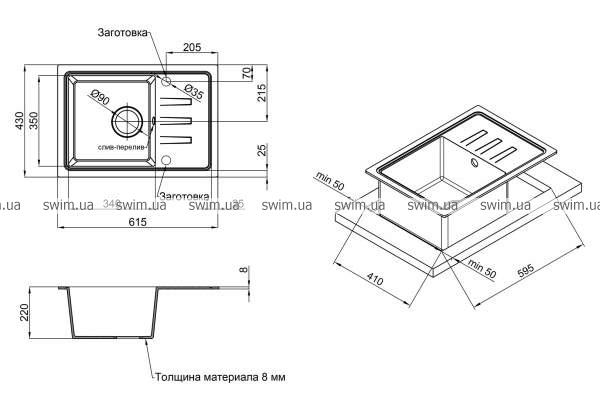 • Комплектация Мойка, сифон, слив/перелив, корзинчатый вентиль, крепеж.