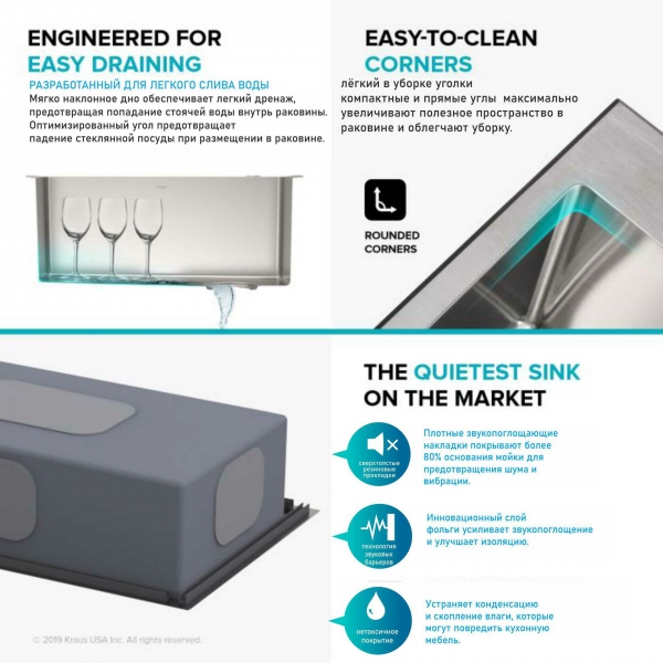 - Спроектирована для удобного слива воды со смещенным сливом, наклонным дном и канавками, чтобы в раковине не стояла вода