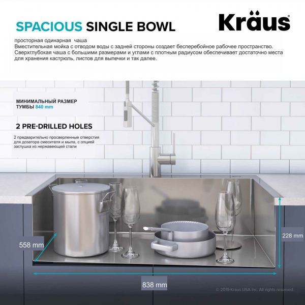 - 2 предварительно просверленных отверстия - для установки смесителя и дозатора моющего средства. В комплект входит заглушка из нержавеющей стали, когда второе отверстие не используется.