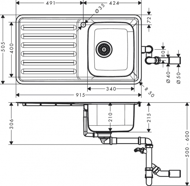 • отверстие для смесителя предварительно определено (см. чертеж в масштабе)