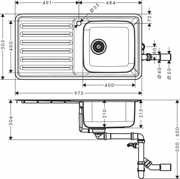 - отверстие для смесителя предварительно определено (см. чертеж в масштабе)