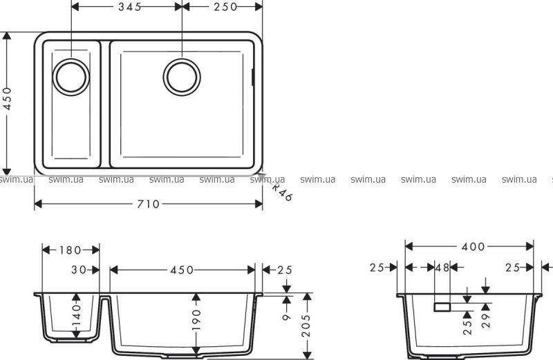 - положения перелива: с правой стороны основной чаши