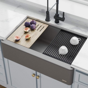 Мойки Bellucci™, рассчитанные на длительный срок службы, устойчивы к ударам, царапинам и пятнам, что обеспечивает их долговечность, надежность и стиль. Встроенная планка рабочей станции служит платформой для аксессуаров, которые скользят по раковине, так что вы можете работать, не теряя места на кухонном столе. Чтобы помочь вам оптимизировать ваше рабочее место, в комплект поставки входит разделочная доска премиум-класса с уникальным современным дизайном.