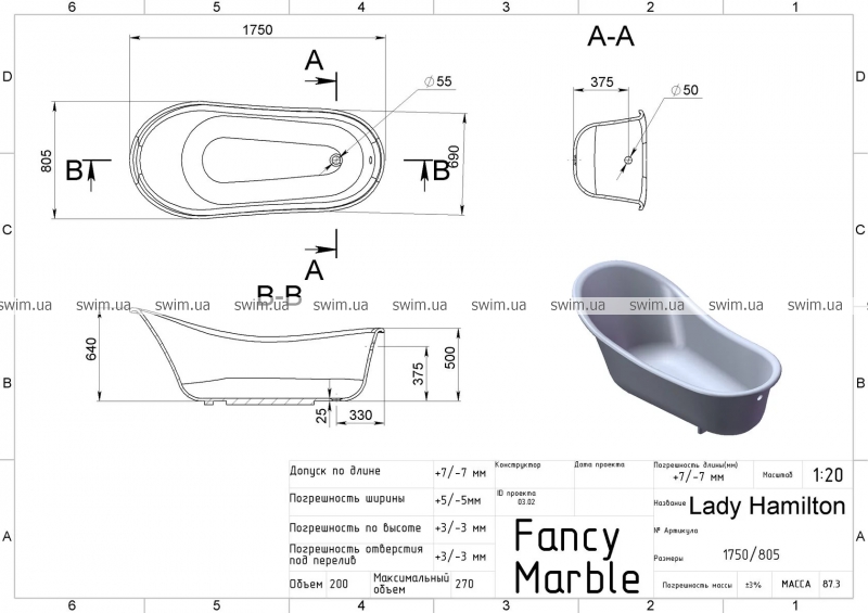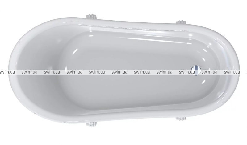 Ванна, що окремо стоїть, з литого мармуру зі зливним отвором у підлозі і переливом. Ванна відрізняється високою міцністю, теплопровідністю і може бути встановлена біля стіни або серед кімнати. Ніжки до ванни та сифон з переливом можуть бути у кількох кольорових виконаннях, комплектуються до ванни додатково та не включені у вартість.