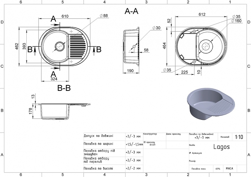 - Комплектація: Кухонна мийка, сифон одинарний з переливом, кріплення, документація