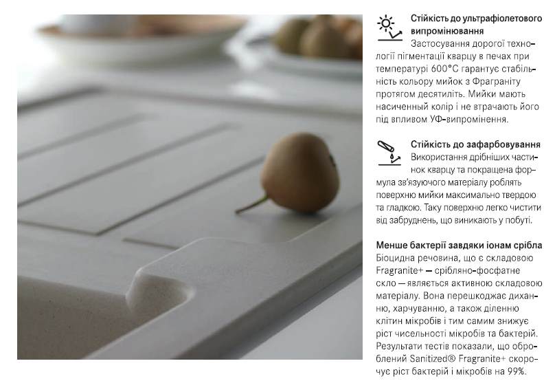 - Активная антибактериальная защита Sanitized® помогает содержать поверхность мойки в чистоте и поддерживает гигиену