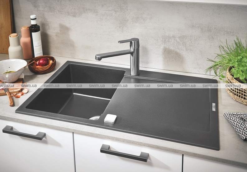 Усовершенствуйте свою кухню с помощью мойки с глубокой чашей GROHE K500, не требующей технического обслуживания и снижающей шум от воды. Это врезная мойка (86x50cm) полностью оборачиваемая (может быть как левой так и правой) и отлита из 80% кварца и 20% акриловой смолы и отвердителя, который защищает от пятен, царапин, тепловых воздействий и механических повреждений.