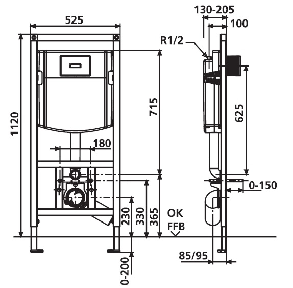 - 2 болта для крепления унитаза М12 с диапазоном регулирования 180 мм с защитными колпачками и гайками