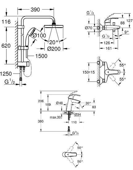 - универсальный монтаж: подключение к смесителя / подключение с 1250 мм душевым шлангом с резьбой в 1/2 "