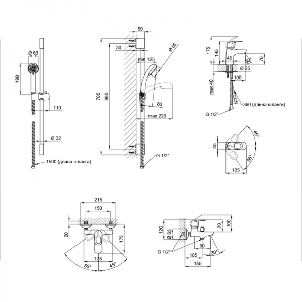 - Ширина изделия, мм: смеситель для ванны: 215. Смеситель для умывальника: 45