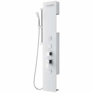 При производстве стеклянных душевых панелей используется стекло толщиной 5 мм. Верхняя часть душа представлена душевой лейкой, изготовленной из хромированной нержавеющей стали. Панель оснащена белыми полками с алюминиевым покрытием, твердым смесителем из латуни, и шлангом для подачи горячей и холодной воды (испанской марки Tucai).