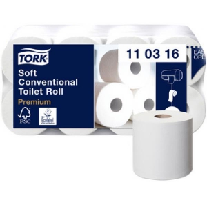 М'який туалетний папір у стандартних рулонах Tork забезпечить вашим гостям домашній комфорт далеко від дому. Цей м'який туалетний папір чудовий на вигляд і на дотик і має характеристики, які необхідні в туалетних кімнатах з низькою прохідністю.
