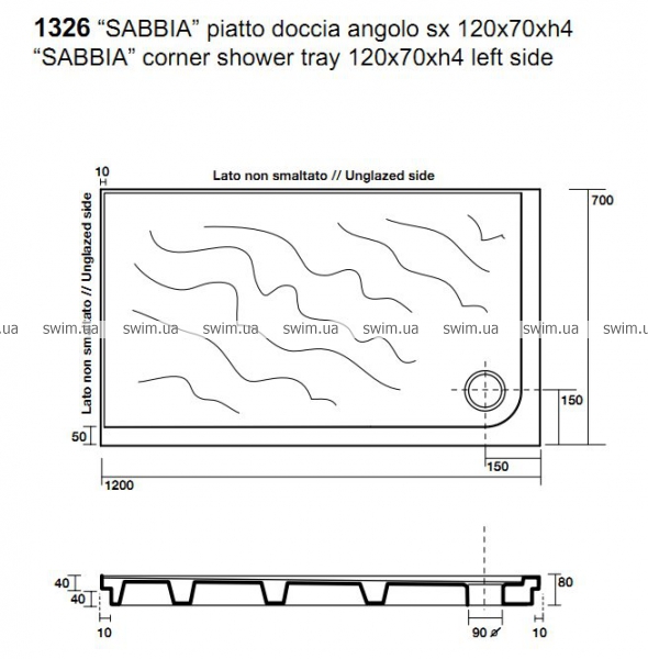 Прямокутний керамічний душовий піддон Kerasan Dune "Sabbia" 120x70х8 см, лівосторонній, колір білий. Душовий піддон кутовий SX 70х120х4 см із ефектом піску.