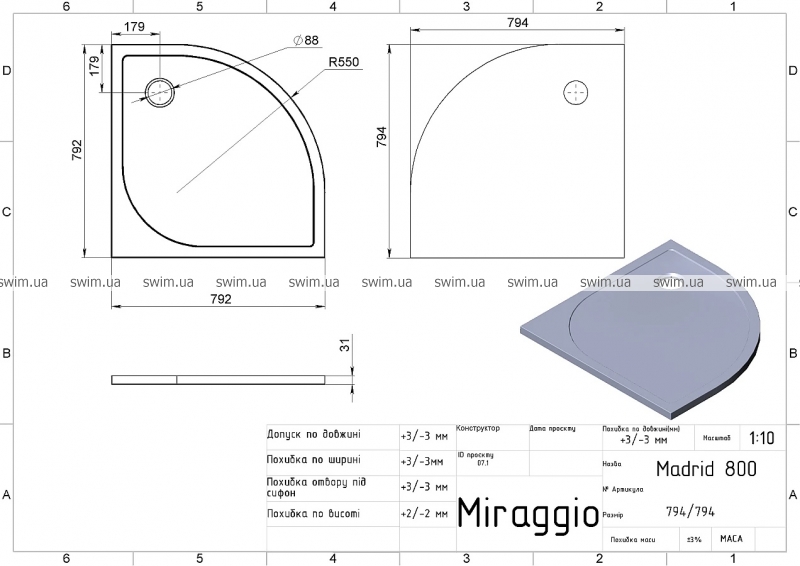 Піддон душовий Miraggio MADRID 800 0000611 80х80 см