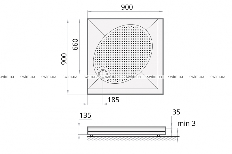 Висота піддону – 35 мм, з декоративною панеллю та регульованими ніжками – 135 мм.