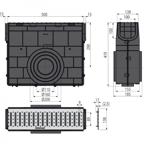 - Бокове підключення до каналізаційного стоку Ø110, 160, 200 мм