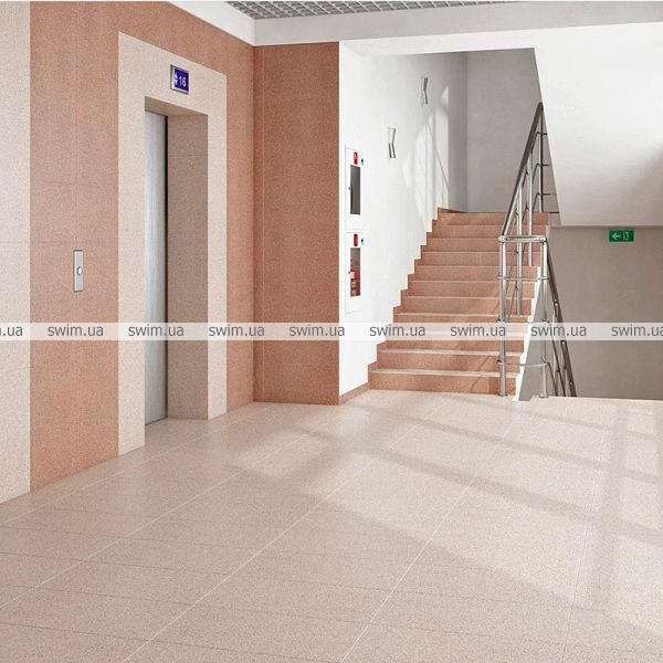 плитка імітує натуральний камінь, відтінок сіль із перцем. На такій плитці не видно бруду, а значить її можна використовувати у коридорі, не хвилюючись про необхідність постійно проводити вологе прибирання;