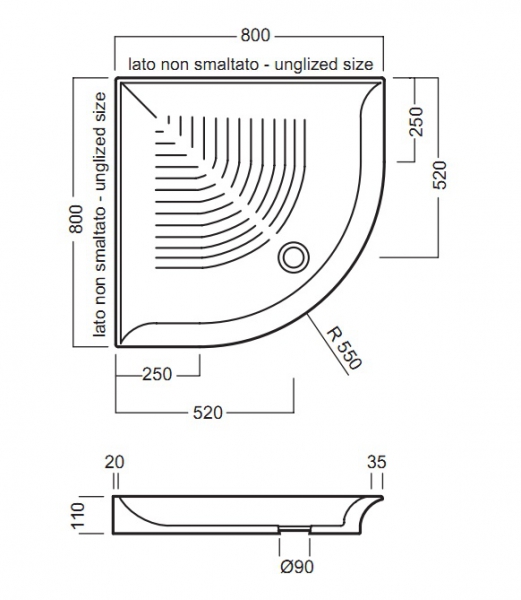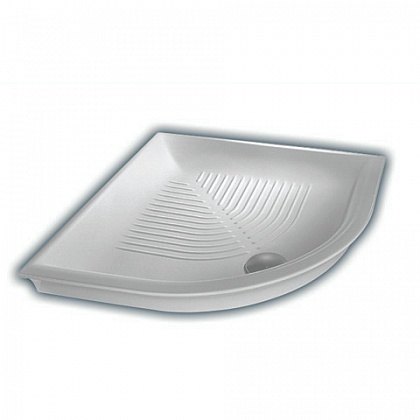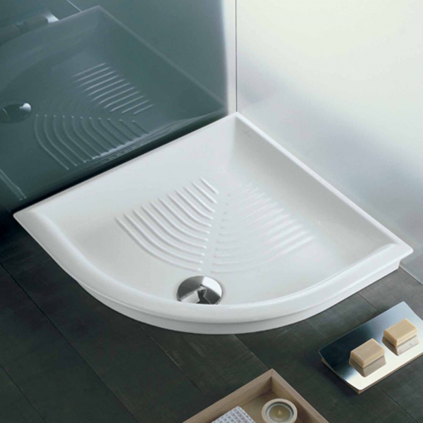 Угловой керамический душевой поддон со сливным отверстием 90 мм и съемным гидрозатвором, удобный в обслуживании. Крышка выпуска – круглая хромированная. Монтируется в пол. Два борта без эмали.