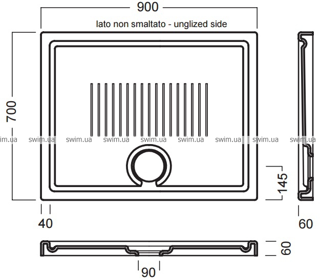 Душевой поддон из керамики со съемным легкоочищаемым сливом 90 мм. Квадратная или круглой крышка сливного отверстия. Встроенная установка или с опорой на пол. Монтаж со сливом дальше от стены, неэмалированная сторона должна быть противоположна сливному отверстию.