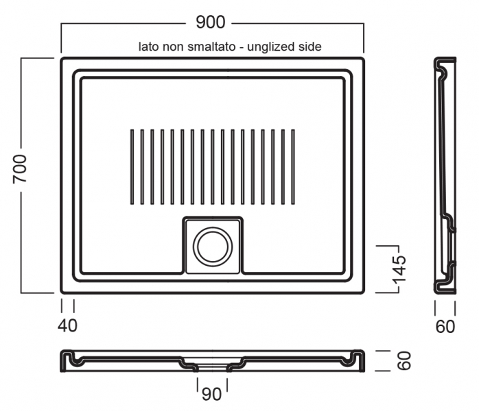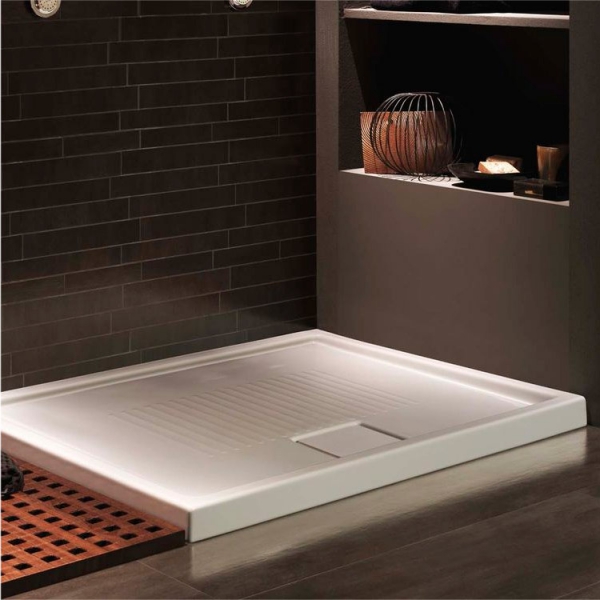 Душевой поддон из керамики со съемным легкоочищаемым сливом 90 мм. Квадратная крышка сливного отверстия. Встроенная установка или с опорой на пол. Монтаж со сливом дальше от стены, неэмалированная сторона должна быть противоположна сливному отверстию.