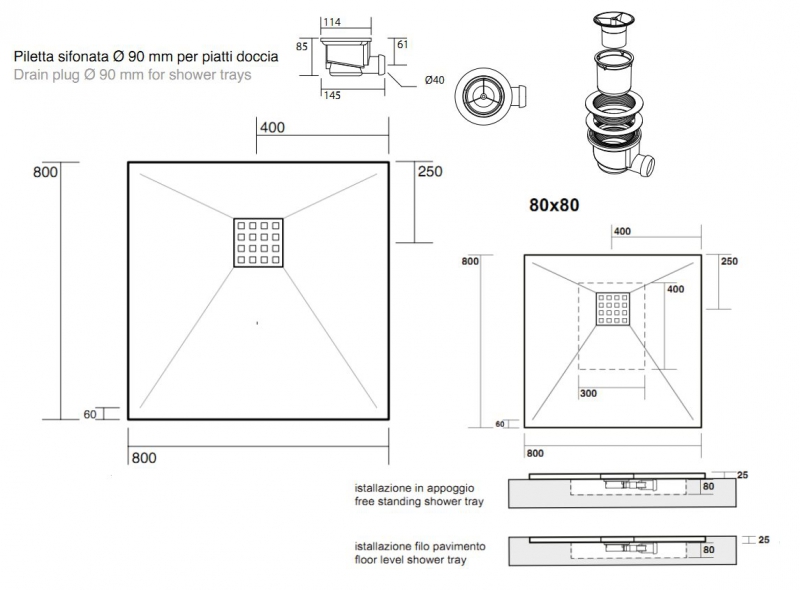 Душевой поддон из литьевого мрамора 80x80, высота 2.5 см, в комплекте с выпуском